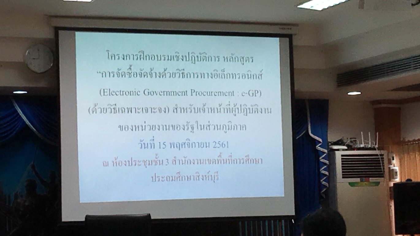 วันที่ 15 พฤศจิกายน 2561 คุณครูสุทธิชา ทิมทอง ได้รับมอบหมายจาก ดร.เพิ่มศักดิ์ บัวรักษ์ ผู้อำนวยการโรงเรียนวัดตึกราชา ให้เข้าร่วมโครงการฝึกอบรมเชิงปฏิบัติการหลักสูตร "การจัดซื้อจัดจ้างด้วยวิธีการทางอิเล็กทรอนิกส์ (Electronic Goverment Procurement : e-GP)" ณ ห้องประชุมชั้น 3 สำนักงานเขตพื้นที่การศึกษาประถมศึกษาสิงห์บุรี