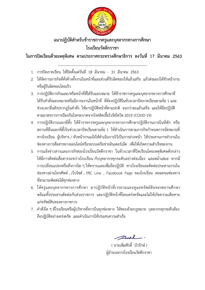 วันอังคารที่ 17 มีนาคม 2563 โรงเรียนวัดตึกราชา โดย ดร.เพิ่มศักดิ์ บัวรักษ์ ผู้อำนวยการโรงเรียนวัดตึกราชา ได้กำหนดแนวปฏิบัติสำหรับข้าราชการครูและบุคลากรทางการศึกษาโรงเรียนวัดตึกราชา ในการปิดเรียนด้วยเหตุพิเศษ ตามประกาศกระทรวงศึกษาธิการ